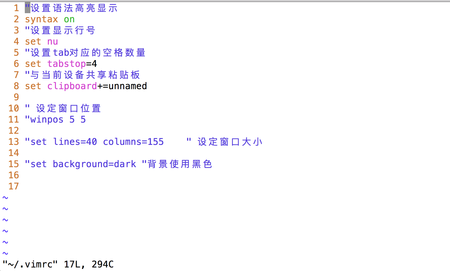在shell中可以通过 vim ~/.vimrc 或者 vim /etc/vimrc 打开vimrc文件对vim进行配置。在这个文件中可以进行很多和vim相关的配置,常用的如下(如果对其他配置感兴趣的可以自己百度):