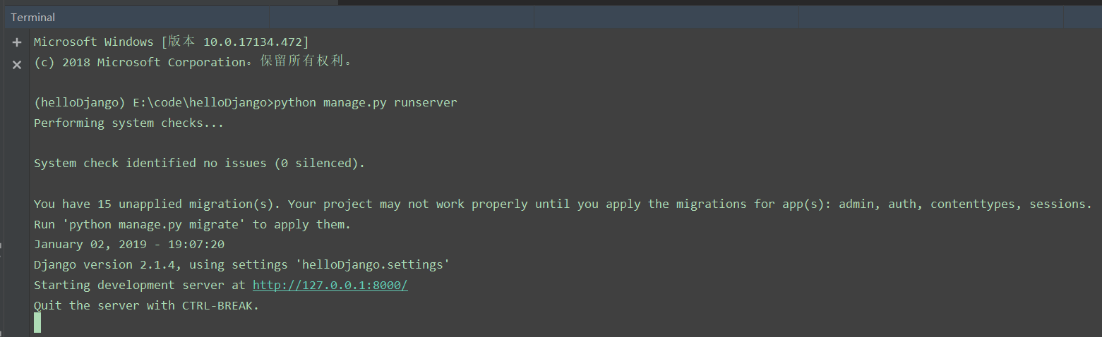 启动命令: python manage.py runserver 默认ip为127.0.0.1 默认端口为8000